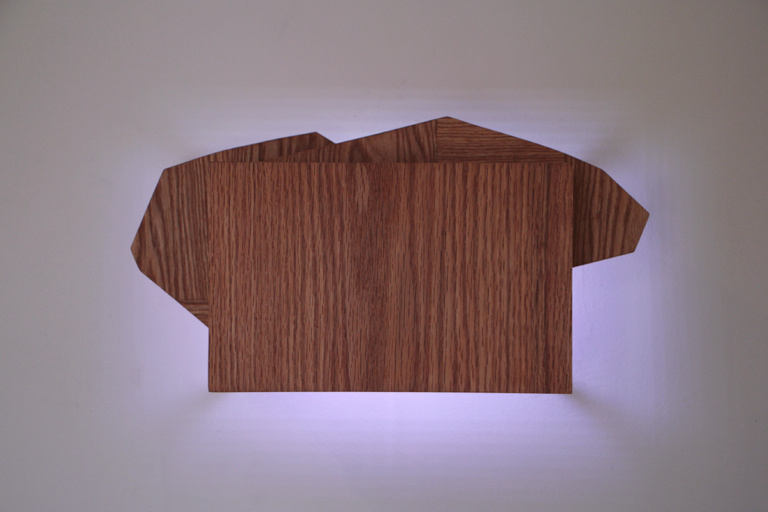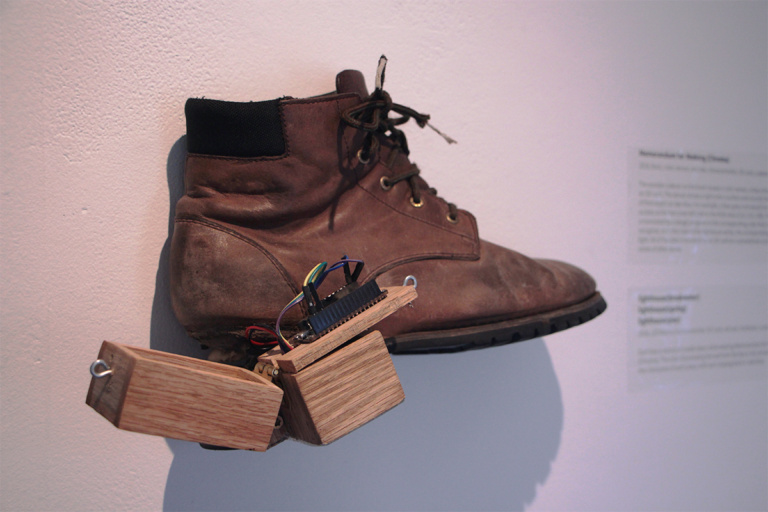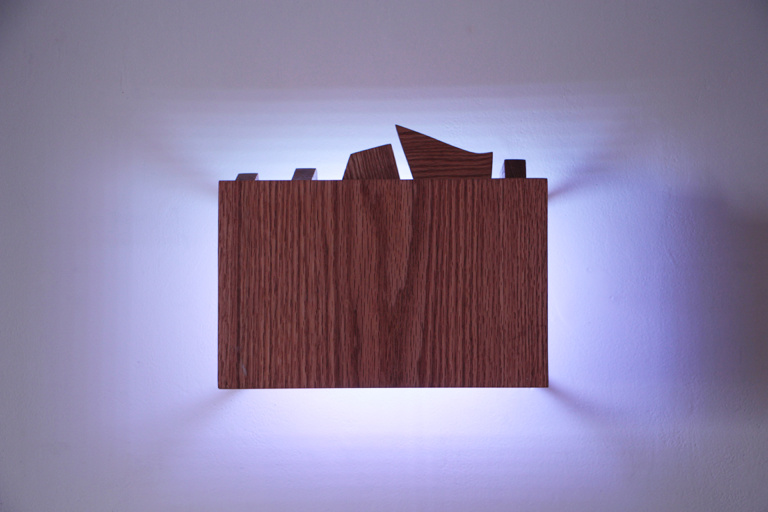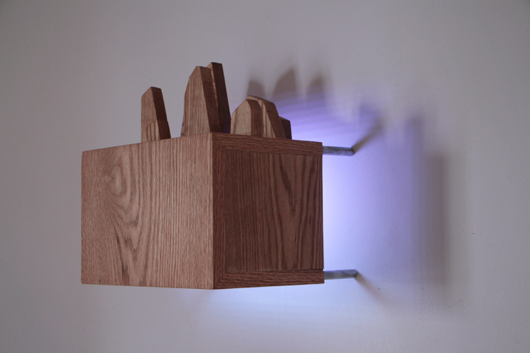 Each box is record of a walk taken while wearing Memorandum for Walking (chroma), a boot with an attached sensor which records the color of the ground below. The color illuminating the wall from the box is the recorded data of the colorspace of each place, with each playing back in real-time and smoothly changing from hue to the next.