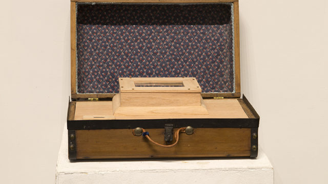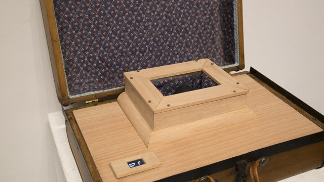 Suitcase (Lee Horwitz), Wood, Glass, Arduino Micro-controller, Thermometer, OLED, Peltier, Fan, Wires